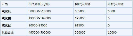 5月11日国内钆铕钇系市场部分价格上涨,氧化钆价格上涨5000元/吨至50.5万元/吨,氧化铕价格为19.5万元/吨,钆铁合金价格上涨1万元/吨至50万元/吨,氧化钇价格为91500元/吨,近期国内轻稀土市场部分价格上涨,但是下游仍处于按需采购阶段,商家采购情绪一般,短期之内价格走高为主。