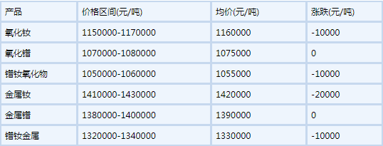 3月14日国内轻稀土部分价格下滑,金属镨钕价格下滑1万元/吨至133万元/吨,镨钕氧化物价格下滑1万元/吨至105.5万元/吨,氧化钕价格下滑1万元/吨至116万元/吨,金属钕价格下滑2万元/吨至142万元/吨,氧化镨价格为107.5万元/吨,金属镨价格为139万元/吨,国内轻稀土市场部分价格走势下滑,下游按需采购为主,场内走销情况一般,观望情绪浓厚,预计后期价格或将小幅回落。