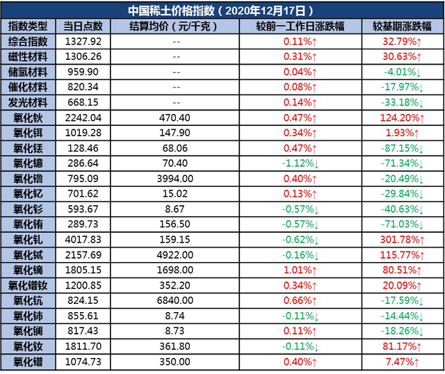 其中,氧化钬、氧化铒、氧化铥、氧化镥、氧化钇、氧化镝、氧化镨钕、氧化钪、氧化镧、氧化镨单品价格指数分别较前一工作日上涨;氧化镱、氧化钐、氧化铕、氧化钆、氧化铽、氧化铈、氧化钕单品价格指数分别较前一工作日下跌。