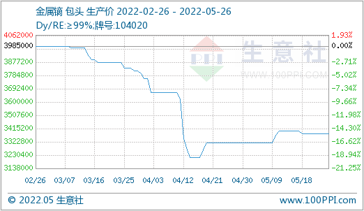 国家环保督察仍在持续,稀土按需采购,目前氧化钕镨的库存变化不大,买货商家受买涨不买跌情绪影响,场内价格走势小幅上涨。据统计新能源汽车需求增加,中国汽车工业协会公布的数据显示,2022年4月份我国汽车产销量分别达120.5万辆和118.1万辆,环比下降46.2%和47.1%,同比下降46.1%和47.6%,汽车产销量有所下滑,近期新能源领域需求正常,国内轻稀土市场行情涨幅不大,国内重稀土市场价格维持稳定。